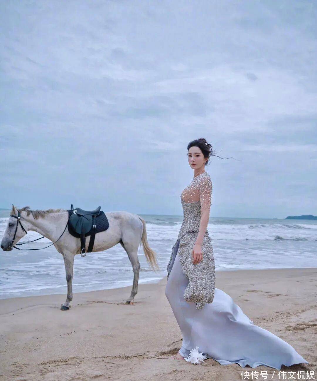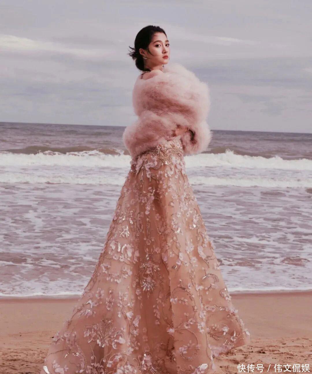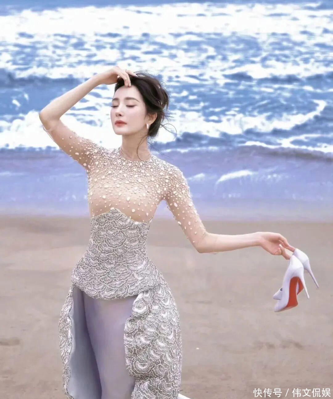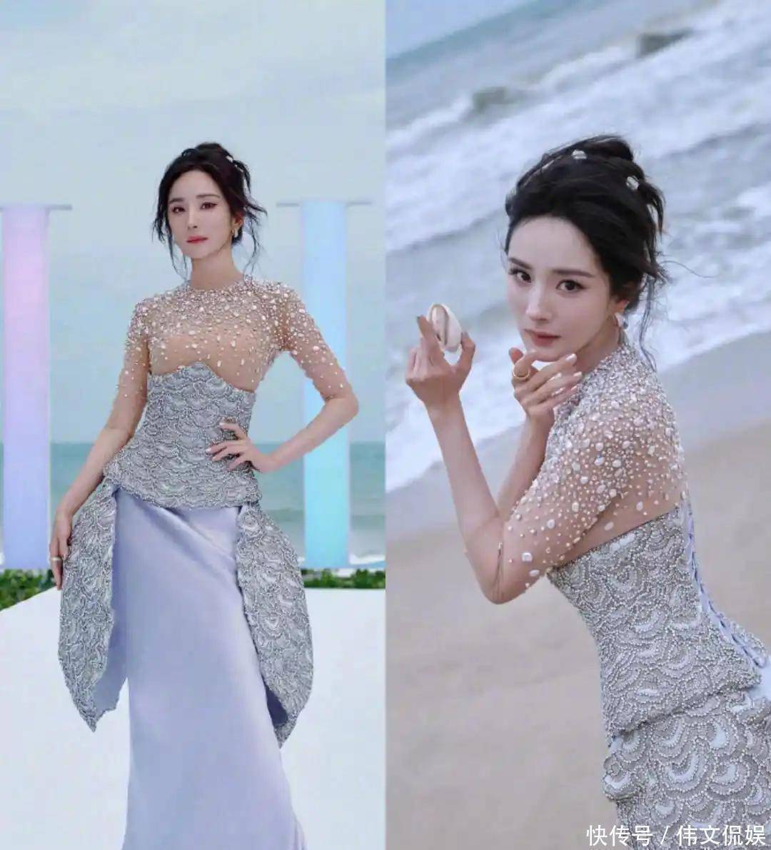 当天,杨幂穿了一身浅蓝色的礼裙,上半身是那种透明的网纱,有很多闪闪发光的珍珠。下面的裙子是蚌壳刺绣缎面,搭配蓝色的裙身,有一种清新优雅的美。在海边背景的衬托下,杨幂就如同一条灵动的美人鱼,这身造型与她的气质也很搭。