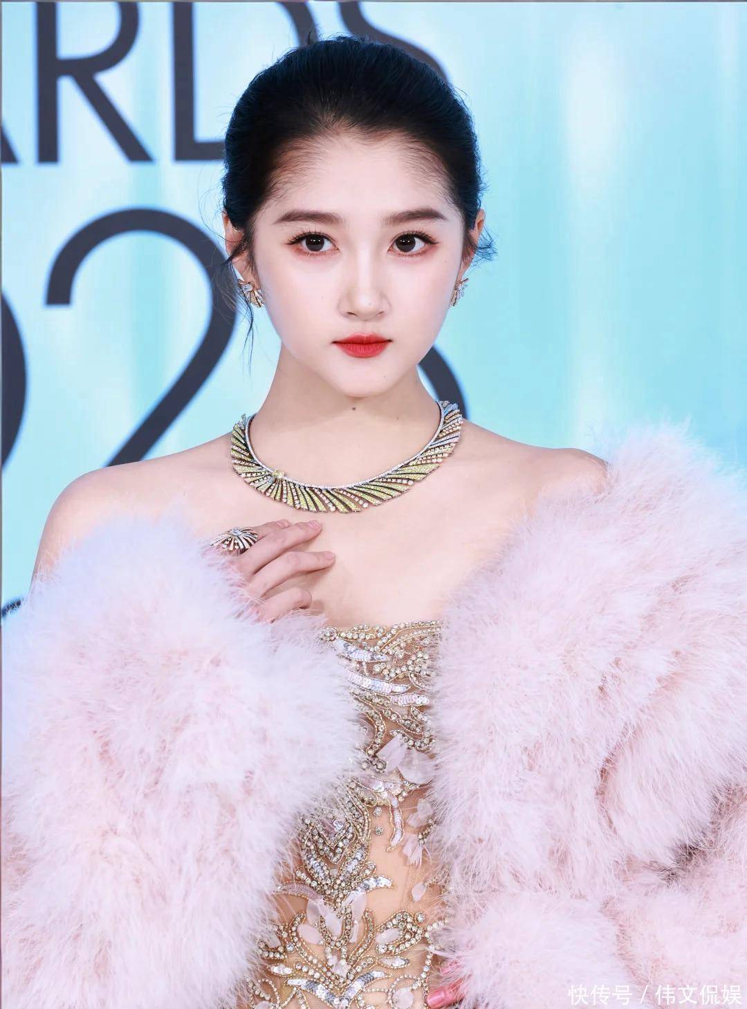 关晓彤这次的造型也很不错,她穿着一条香槟色的蕾丝裙,搭配粉色的毛绒披肩,有一种优雅的贵妇范儿。这么苛刻的镜头下才能感觉到,关晓彤的颜值确实挺能打的,她梳着一头大光明发型,还戴着高级珠宝,有一种珠光宝气的感觉。